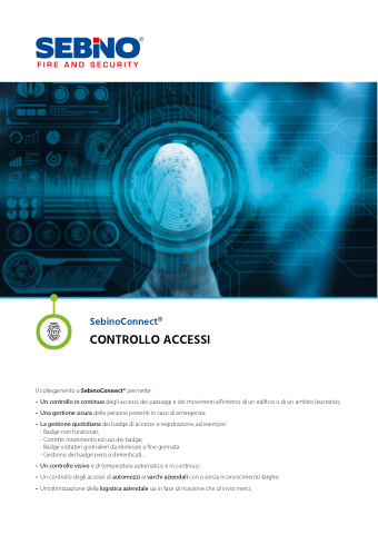 SebinoConnect®CONTROLLO ACCESSIIl collegamento a SebinoConnect® permette:• Un controllo in continuo degli accessi, dei passaggi e dei movimenti all’interno di un edi cio o di un ambito lavorativo;• Una gestione sicura delle persone presenti in caso di emergenza;• La gestione quotidiana dei badge di accesso e registrazione, ad esempio: - Badge non funzionati;- Corretto inserimento ed uso dei badge;- Badge visitatori giornalieri da eliminare a ne giornata- Gestione dei badge persi o dimenticati...• Un controllo visivo e di temperatura automatico e in continuo;• Un controllo degli accessi di automezzi ai varchi aziendali con o senza riconoscimento targhe;• Un’ottimizzazione della logistica aziendale sia in fase di ricezione che di invio merci;