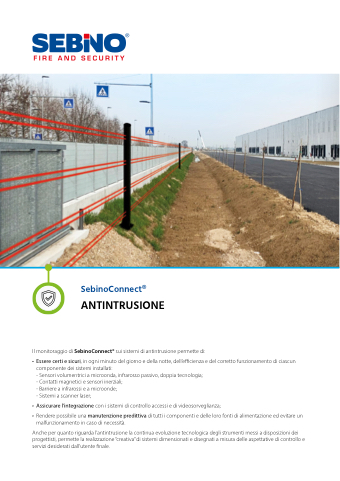 SebinoConnect®ANTINTRUSIONEIl monitoraggio di SebinoConnect® sui sistemi di antintrusione permette di:• Essere certi e sicuri, in ogni minuto del giorno e della notte, dell’e cienza e del corretto funzionamento di ciascun componente dei sistemi installati:- Sensori volumentrici a microonda, infrarosso passivo, doppia tecnologia;- Contatti magnetici e sensori inerziali;- Barriere a infrarossi e a microonde; - Sistemi a scanner laser;• Assicurare l’integrazione con i sistemi di controllo accessi e di videosorveglianza;• Rendere possibile una manutenzione predittiva di tutti i componenti e delle loro fonti di alimentazione ed evitare unmalfunzionamento in caso di necessità.Anche per quanto riguarda l’antintrusione la continua evoluzione tecnologica degli strumenti messi a disposizioni dei progettisti, permette la realizzazione “creativa” di sistemi dimensionati e disegnati a misura delle aspettative di controllo e servizi desiderati dall’utente nale.