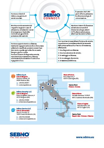 Fornisce ai clienti di Sebino una gamma di servizi connessi.Monitora continuamente tuttii segnali e reagisce in caso di attivazione, contattando i servizi di emergenza e i Keyholder nominati per garantire la protezione dei vostri siti.Fornisce supporto tecnico a distanza.Gestita da ingegneri antincendio e di sicurezza addestrati e quali cati, possiamo essere lì per darvi aiuto e guida ogni volta che ne avete bisogno, giorno o notte.Fornisce soluzioni di diagnostica remota, manutenzione e riparazione a distanza minimizzando la necessità e il costo di un ingegnere in loco.È operativo 24/7, 365 giorni all’anno, attraverso le ultime tecnologie di comunicazione.Monitora i sistemi di rilevazione ed estinzione incendi di diverse tecnologie, sistemi CCTV, allarmi antintrusione, allarmi per lavoratori solitari...Con i suoi tecnici specializzati, fornisce, da remoto, una soluzione immediata evitando la necessità della presenza sica di un Tecnico di Assistenza, e ettuando:1. Una diagnostica a distanza;2. Una manutenzione da remoto; 3. Un settaggio a distanza;4. Un re-settaggio da remoto;5. Un’assistenza telefonica.www.sebino.eu
