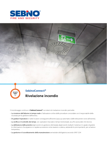 SebinoConnect®Rivelazione incendioIl monitoraggio continuo di SebinoConnect® sui sistemi di rivelazione incendio permette:• La ricezione dell’allarme in tempo reale e l’attivazione online delle procedure concordate con il responsabile dellasicurezza per la gestione dell’evento;• Di guidare l’operatore in tutte le azioni conseguenti all’evento (pop up automatico delle telecamere vicine all’evento);• La veri ca e il controllo dei tempi, con operazioni tracciate e tempi memorizzati, sia a ni assicurativi che tecnici;• La de nizione delle priorità degli eventi e la gestione ottimizzata degli eventi multipli: il sistema è in grado di gestire le informazioni che appaiono in rapida successione come reazioni a catena, valutando le più importanti, per un’azione tempestiva;• La gestione e il coordinamento della manutenzione semestrale obbligatoria secondo UNI11224.