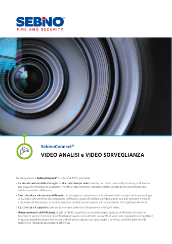 SebinoConnect®VIDEO ANALISI e VIDEO SORVEGLIANZAIl collegamento a SebinoConnect® di sistemi di TVCC, permette:• La visualizzazione delle immagini in allarme in tempo reale: l’utente, nel mezzo della notte, ha bisogno di tempo per trovare le immagini di un allarme; mentre, in sala controllo, l’operatore professionista arriva velocemente alla valutazione video dell’evento;• Una più veloce valutazione dell’evento: in sala regia un operatore può focalizzarsi sulle immagini più importanti per arrivare più velocemente alla valutazione dell’evento grazie all’intelligenza video aumentata (per esempio: invece di controllare 40 telecamere, a monitor vengono portate in primo piano solo le telecamere che registrano l’evento);• L’assistenza e il supporto quando, ad esempio, si devono estrapolare le immagini video;• il mantenimento dell’e cienza: la sala controllo garantisce un monitoraggio continuo, veri cando che tutte le telecamere siano in funzione; al veri carsi di un’avaria, viene attivato un evento di video loss, segnalazione importante in quanto potrebbe essere relativa a una disfunzione oppure a un sabotaggio. Il continuo controllo permette di mantenere l’impianto alla massima e cienza.